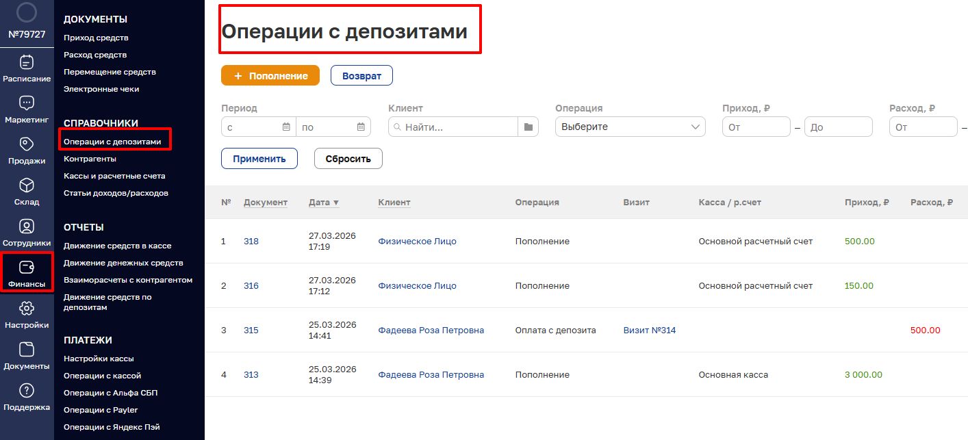 Важно: Оформление возвратов и просмотр отчетов по депозитам доступны только при наличии соответствующих прав доступа.