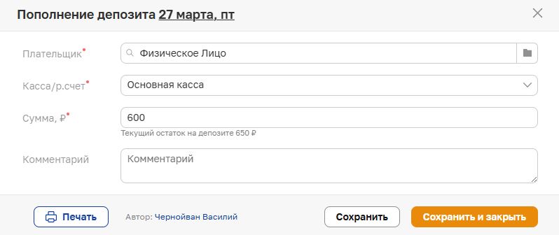 Депозит - это специальный счет, на котором учитываются авансы, внесенные клиентом, с которого можно оплачивать визиты.