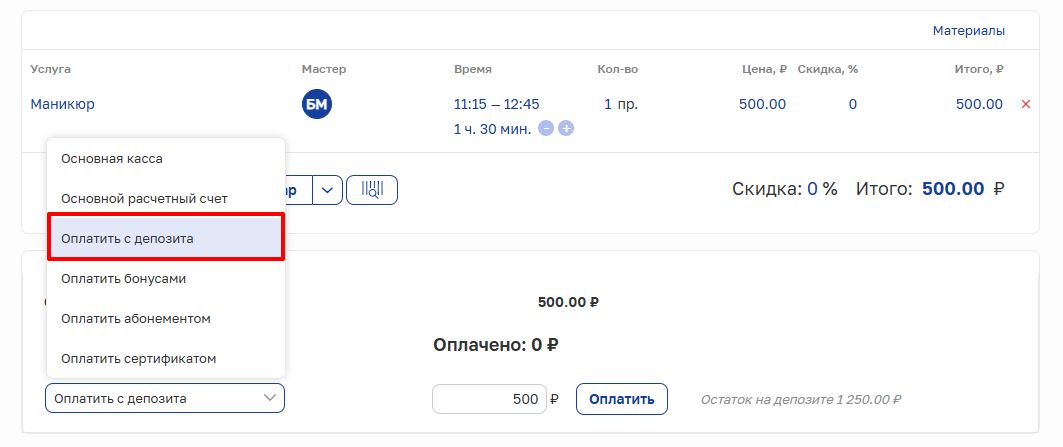 Шаг 2. Выберите способ оплаты «Оплатить с депозита». Справа отобразится доступный остаток на депозите