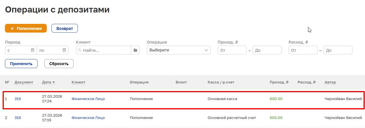 Шаг 4. Убедитесь, что баланс депозита увеличился в карточке визита.