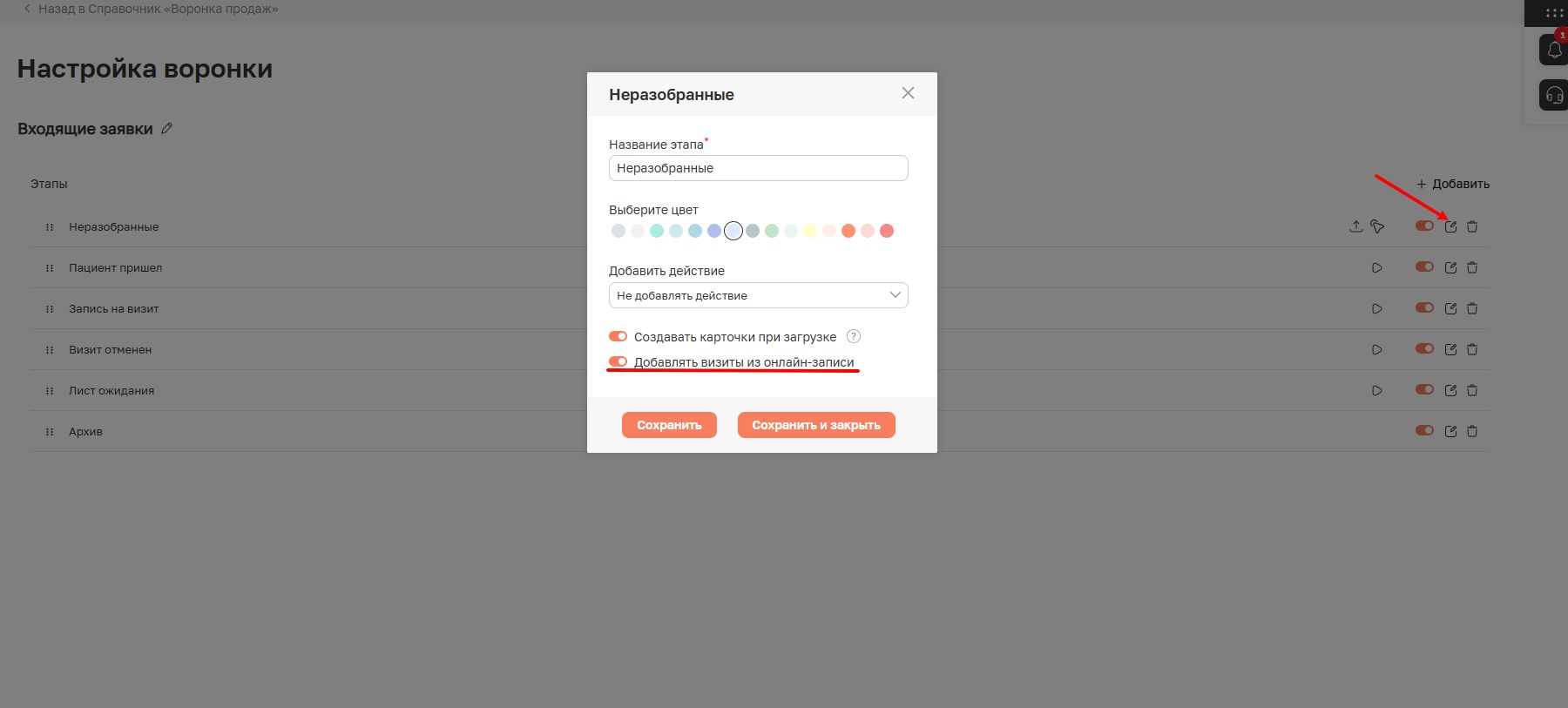 Примечание. Включить настройку «Добавлять визиты из онлайн-записи» можно только для одного этапа в воронке.