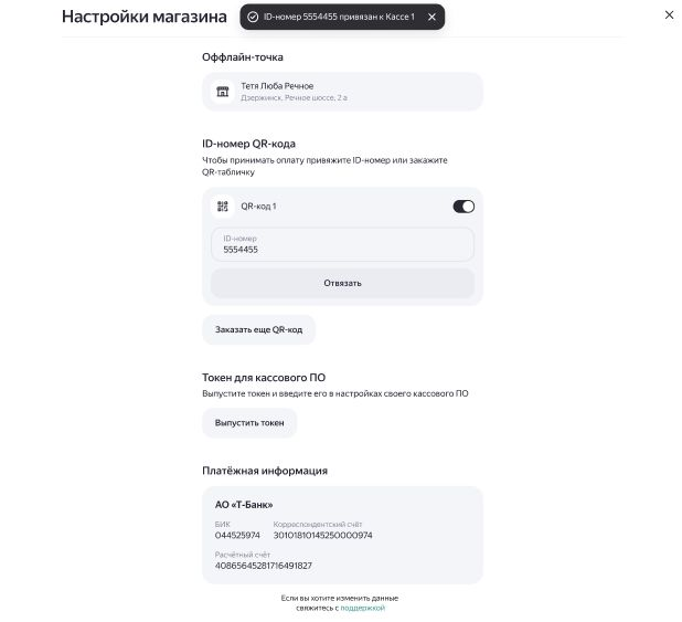 Также одна касса может быть привязана только к одному платежному агрегатору. Если выбранная касса уже используется другим сервисом (например, Альфа СБП или Payler), потребуется выбрать другую или создать новую.