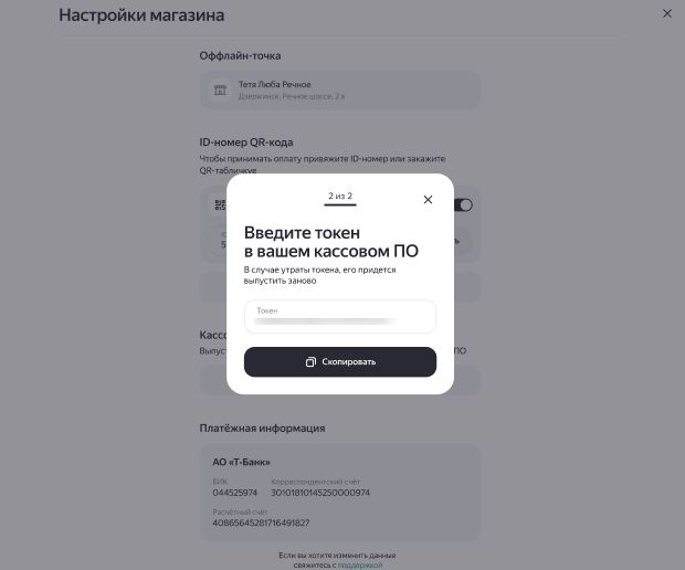 В настройках магазина в Яндекс Пэй нажмите «Выпустить токен». После этого откроется модальное окно с токеном - его необходимо обязательно скопировать и сохранить в удобное место.