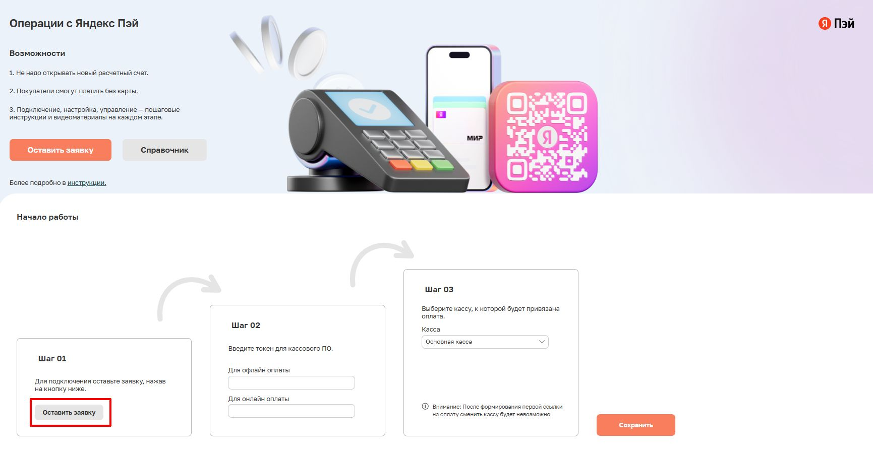 Кнопка ведёт в интерфейс Яндекс Пэй, где выполняется регистрация организации, выбор способов оплаты и выпуск токенов. Если заявка уже была подана ранее, повторно использовать этот блок не требуется.