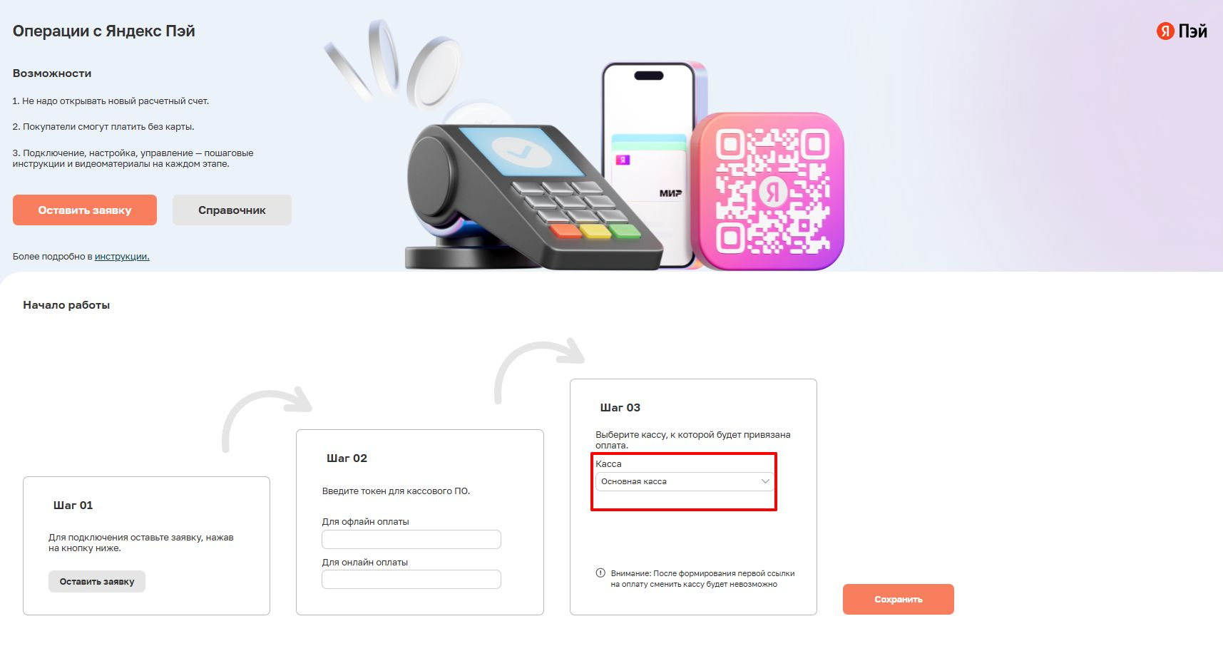После проведения первой транзакции через Яндекс Пэй изменить выбранную кассу будет невозможно.