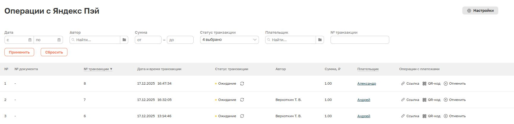 Для того чтобы сформировать оплату через Яндекс Пэй, нажмите кнопку «оплатить» на вкладке «Оплата онлайн». После этого появится блок с транзакцией. В каждой транзакции есть возможность выбрать способ оплаты - по ссылке или по QR-коду.