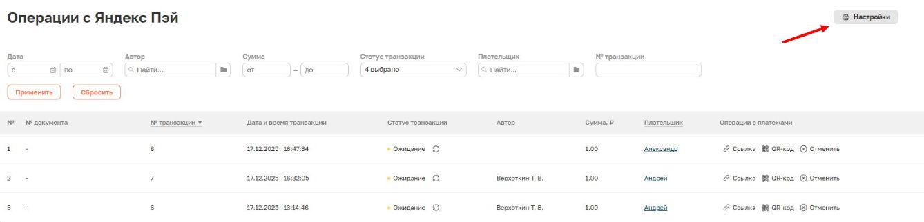 Если потребуется вернутся в настройки Яндекс Пэй - в справочнике «Операции с Яндекс Пэй» справа сверху необходимо нажать на кнопку «Настройки».