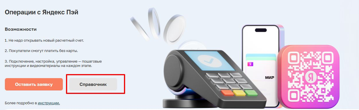 Чтобы открыть справочник операций с Яндекс Пэй необходимо нажать на кнопку «Справочник» на экране настроек.