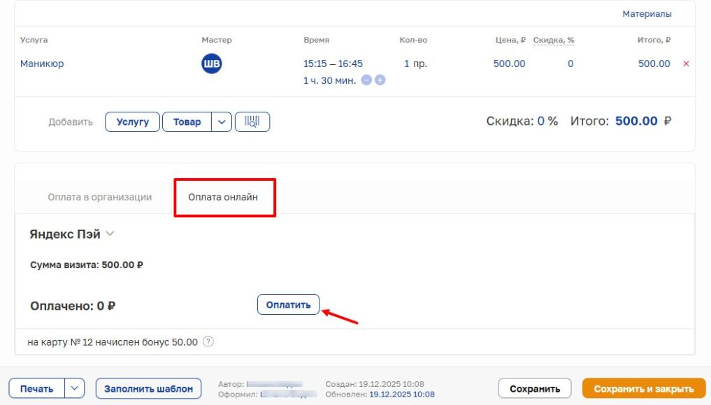 Для оплаты с помощью Яндекс Пэй создайте визит, заполните все нужные услуги или товары и нажмите кнопку «клиент пришел», после чего появится блок оплаты.