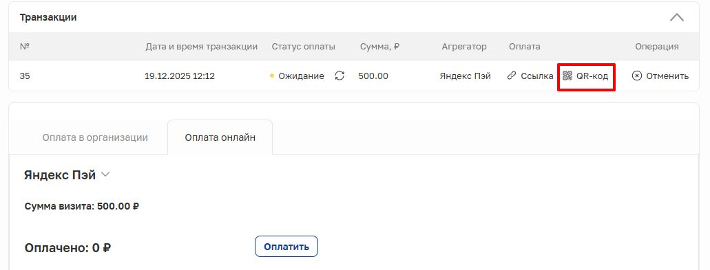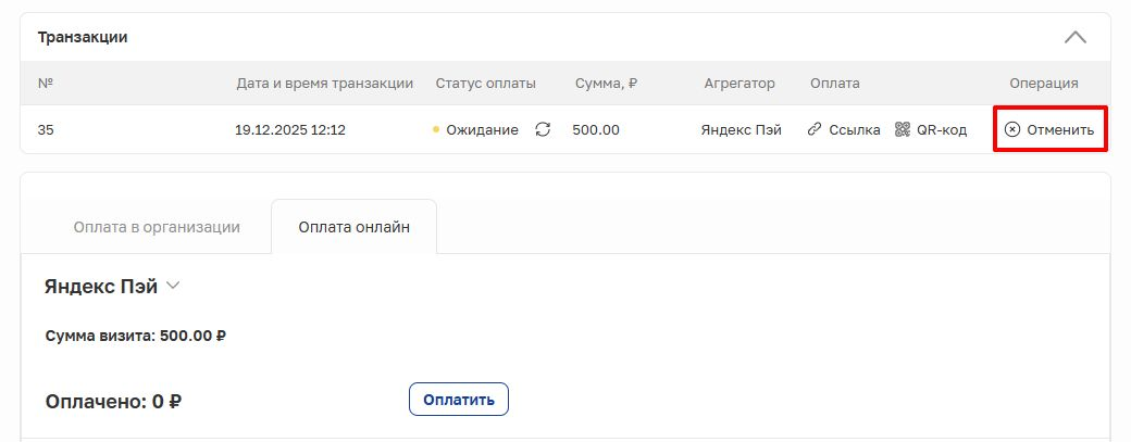 После успешной оплаты визита через Яндекс Пэй в транзакции визита будет отображаться статус «Успешный».