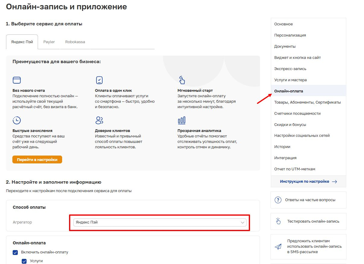 Для приема оплат через Яндекс Пэй в модуле онлайн записи необходимо дополнительно включить платежный агрегатор в настройках онлайн записи. Для этого нужно перейти в раздел Настройки - Онлайн-запись и приложение, затем в правой боковой панели выбрать подраздел Онлайн-оплата.